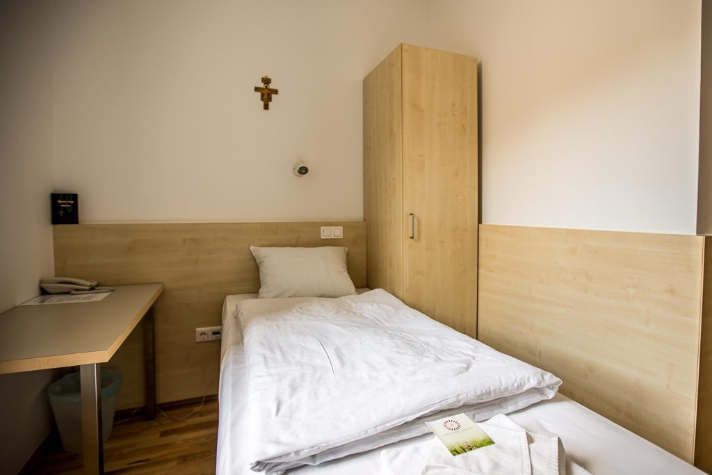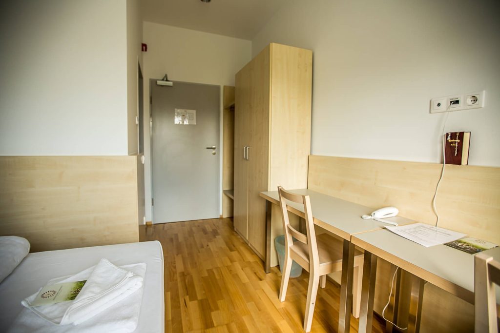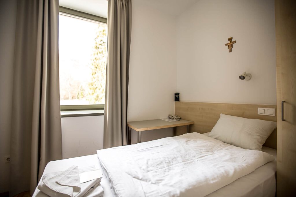 A szállás a szentkúti zarándokház modern, privát fürdőszobás, egy vagy kétágyas szobáiban található.