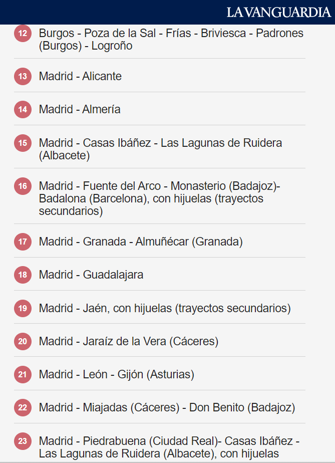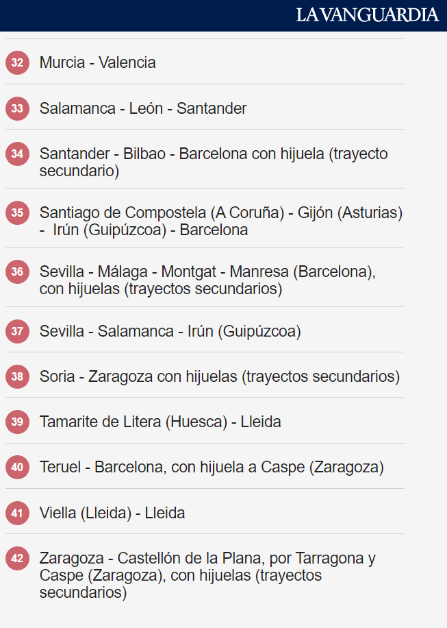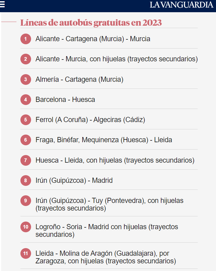 Összesen 42 autóbusz-útvonalon lehet ingyenesen közlekedni 2023-ban Spanyolországban. A kormány a szeptemberben bevezetett 50 százalékos kedvezményt 100 százalékra emeli nem sokkal azután, hogy több Renfe-vonatjáraton is lehetővé tették a térítésmentes utazást.